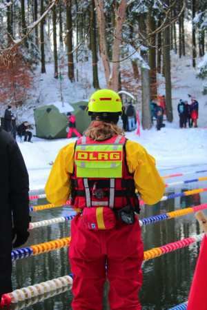Tatkräftige Unterstützung gab es von der Wasserwacht Dresden. Sowohl direkt am Wasser, als auch mit einem aufgewärmten Sanitätszelt, standen wir für die Betreuung der mutigen SportlerInnen bereit, welche sich in das 2,5 Grad kalte Wasser trauten. Respekt!